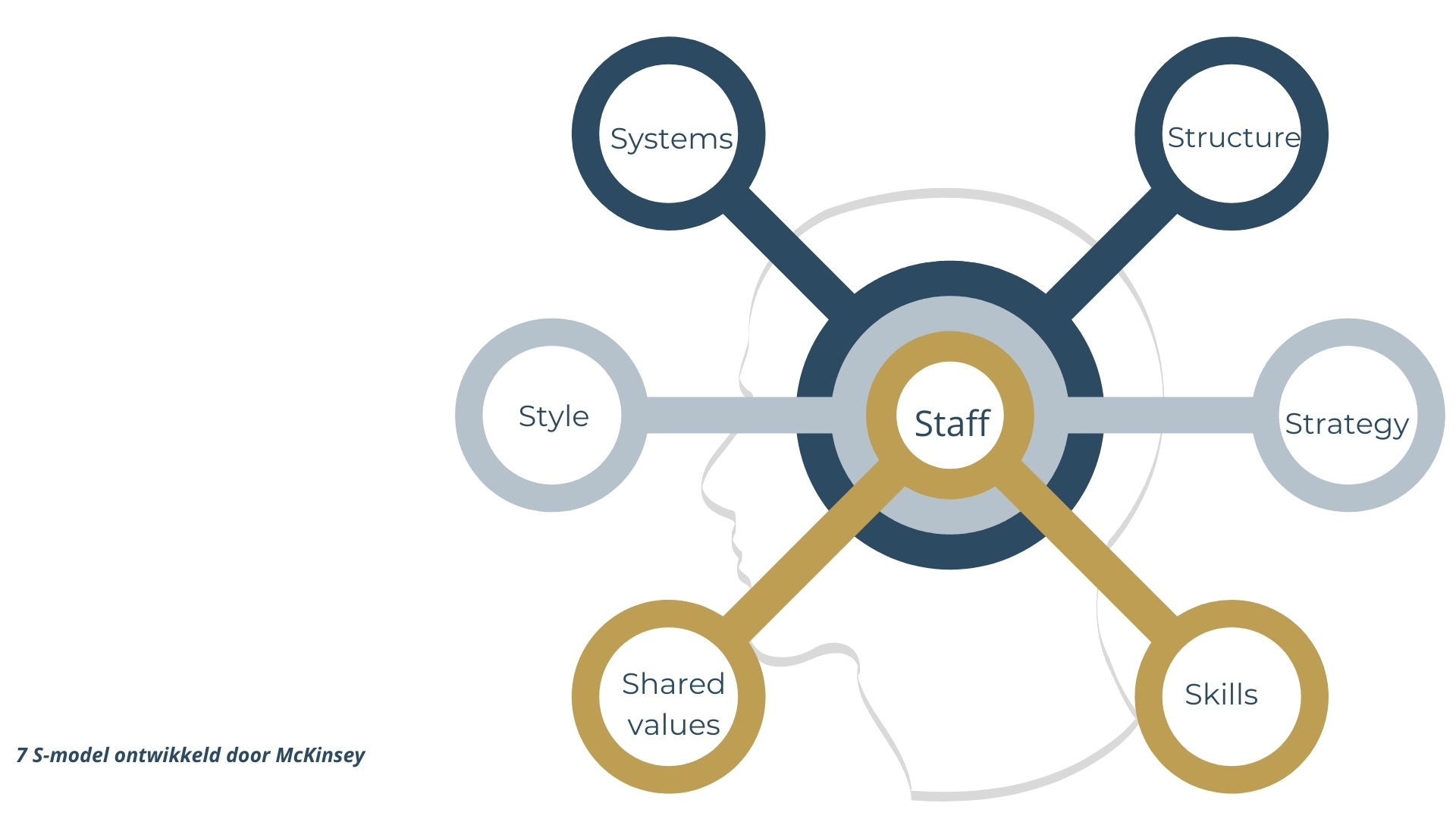Dit is een aangepast 7S-model aangezien wij van mening zijn dat de mens, de medewerker, het centrale en belangrijkste onderdeel is van de organisatie. Het model van McKinsey is het meest gebruikte en het meest succesvolle bedrijfskundige model ooit. Praktisch en goed werkbaar.