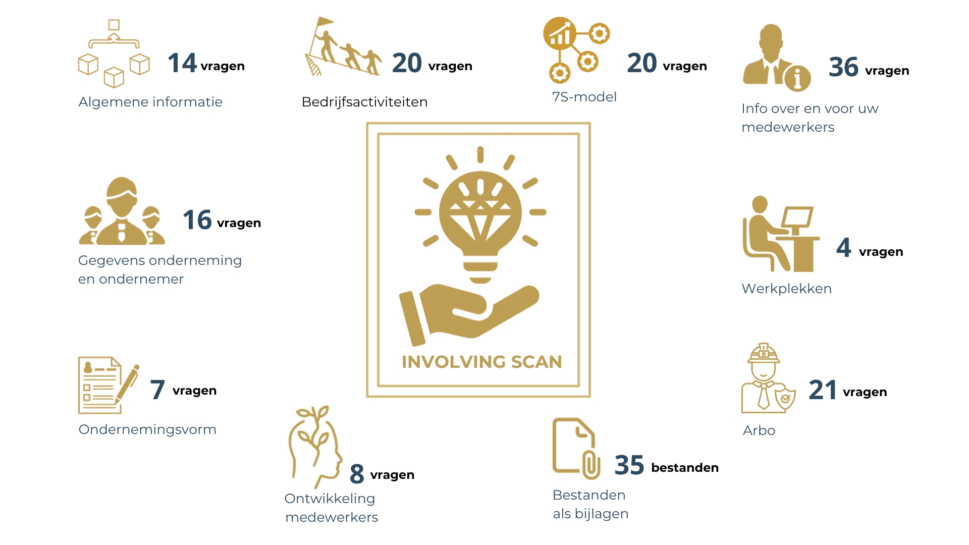 Voor onze scan hebben wij een groot aantal vragen ontwikkeld over verschillende onderwerpen en thema’s. Ieder onderdeel is cruciaal om in te kunnen zoomen op dat deel en om de samenhang met andere velden te beoordelen.